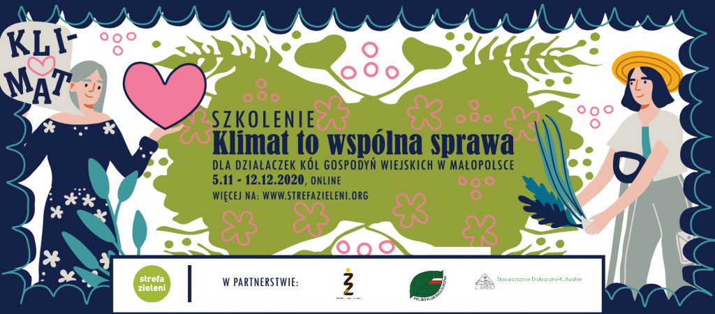 Fundacja Strefa Zieleni organizuje je w dniach od 5 listopada do 12 grudnia 2020. Dowiecie się jak zmienia się klimat, dlaczego, jak to wpływa na nasze życie i nasze środowisko, wreszcie co możemy zrobić żeby zmniejszyć nasz własny „ślad klimatyczny” i żeby lepiej się dostosować do zmieniającego otoczenia. Szkolenie to nie tylko możliwość zdobycie nowej, ważnej wiedzy, ale też szansa na nowe doświadczenia, umiejętności i ciekawe znajomości. Poruszane zostaną zagadnienia związane z klimatem – zdrowie, woda, rolnictwo, żywność.
